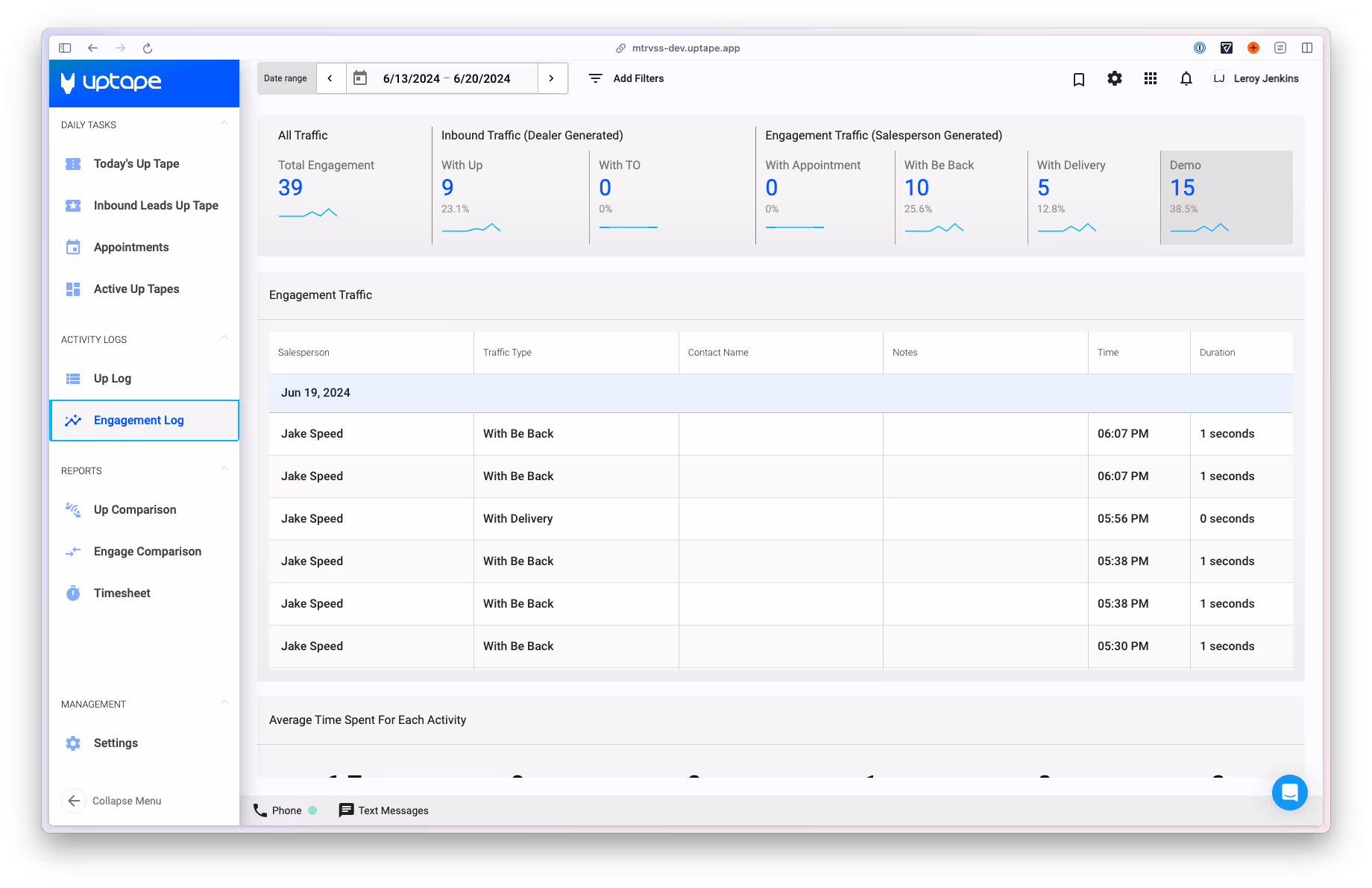 The Engagement Log is similar to the Up Log, but it usd for tracking lead engagement rather than up activity. By default the report will generate the past seven days of data, but any custom date can be selected using the date picker at the top left of the screen.