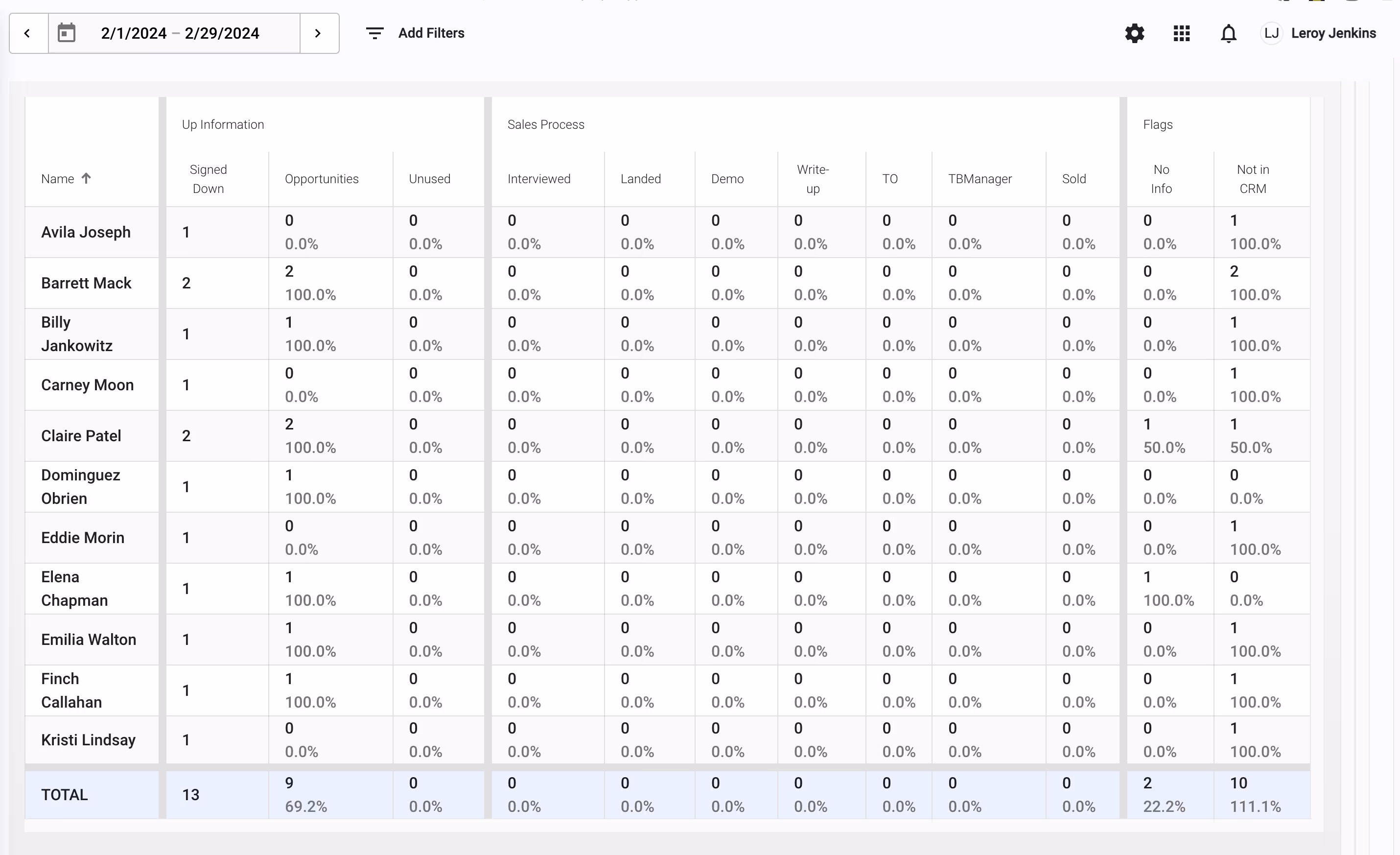 The Up Comparison Report is used to compare Up information from salesperson to salesperson. The report is sorted alphabetically by salesperson. Each section of the report shows the count for the specified date range, as well as a percentage to show the weight of the item in comparison to the other items within the report section. The remainder of the report is then separated out into 3 sections: